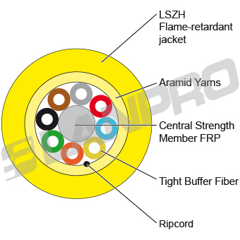 LP-OC31: Tight Buffer Distribution Fiber Optical Cable, LSZH rated Jacket with FRP Central Strength member.