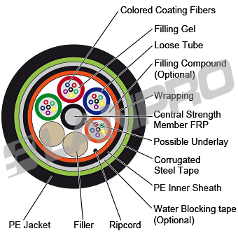 * UV- and moisture-resistant design. * Rodent-resistant construction. * GEL Water Block cable core for protection against moisture filling cavity between FRP strength member and inner PE sheath. (Optional). * One or Two Water block tapes are applied contra helically between corrugated steel tape and inner PE sheath. * Buffer tubes are stranded around the dielectric central strenght member using the