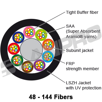 The use of SAA® (Super Absorbent Aramid®) Multi-Fiber Aramid® yarns found in the cable is an excellent means of producing a dry cable design. It can absorb several times its weight in water, and guarantees the performance even if the cable is exposed to humidity; plus it is ideal as a strength member (as ensures tension-resistance and long-term stability in the field).