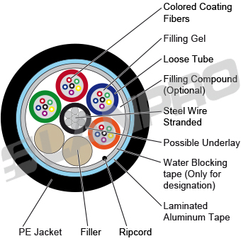 These cables are constructed by Loose Tubes, Central Steel wire/stranded strength member and moisture barrier inner sheathed, protected by a black external PE jacket UV- and moisture- resistant design.