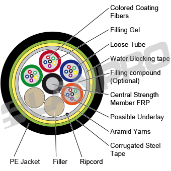 These cables are constructed by Loose Tubes, armor with corrugated steel tape for rodent a crushing protection, Central strength member of FRP and moisture barrier inner sheathed, protected by a black external PE jacket UV- and moisture- resistant design.