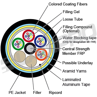 Loose tube style, optical fiber cable with non-metallic central strength member of FRP and peripheral strength members with moisture barrier inner sheathed and Laminated Aluminum Tape. Cable protected by a black PE oversheath, suitable for duct or aerial application. Tubes contain optical singlemode or multimode fibers color coding scheme.