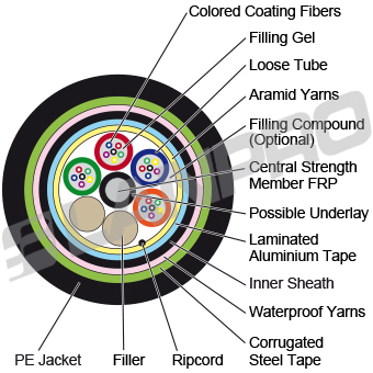These cables are constructed by Loose Tubes, armor with corrugated steel tape for rodent and crushing protection, Central strength member of FRP and moisture barrier inner sheathed, an internal PE jacket, laminated aluminum tape to increase the crushing strength and finally is protected by a black external PE jacket UV- and moisture- resistant design.