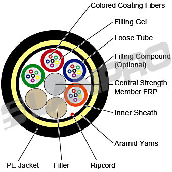 Loose tube style, optical fiber cable with FRP central strength member and peripheral Aramid yarns and Black polyethylene sheath suitable for overhead installation as pole-to-pole or pole-to-premises. Tubes contain up to 8 Fibers color coded as per color coding scheme.